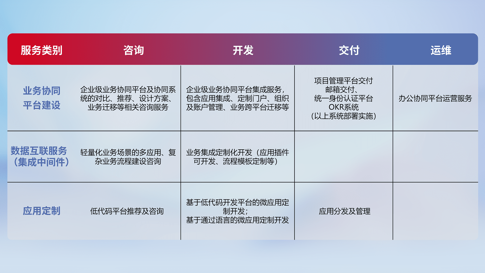 针对钉钉、、、、企微、、、、IDaas等平台级产品提供产品的规划、、、、方案、、交付、、定制化开发等服务,,,,实现如统一协同办公、、智能客户服务、、混合会议管理、、、、智能数据查询、、等业务场景,,,实现数字化转型。。。。