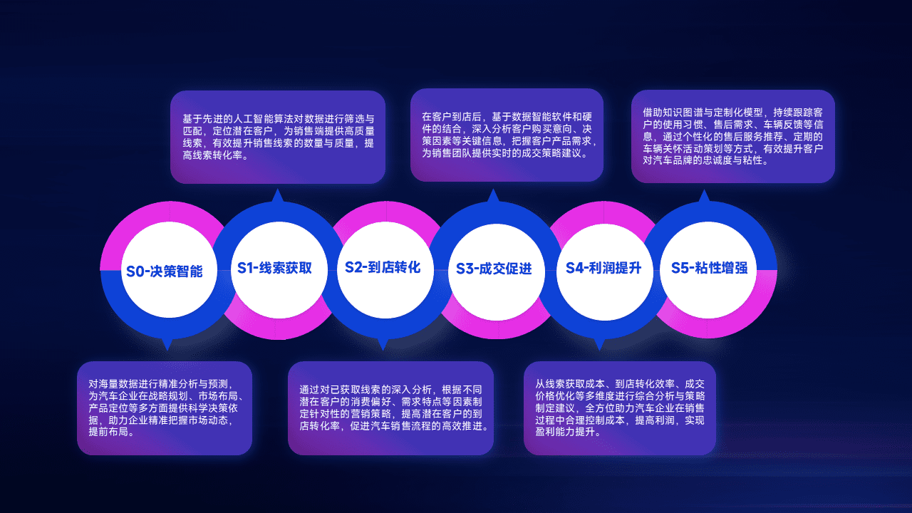 基于销售转化漏斗的薄弱环节,,为客户提供数据+模型+运营的智能应用,,实现销售业绩的提升;推动线索管理全链路的精细化管理和运营。。。